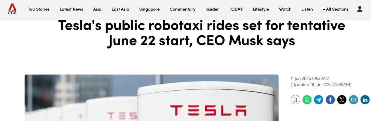 【环球网科技综合报道】6月11日消息,据外媒cna援引路透社报道称,特斯拉首席执行官埃隆・马斯克在 X 上宣布,特斯拉自动驾驶出租车的公共试运行时间暂定为 6 月 22 日。此次试运行将首先在德克萨斯州奥斯汀展开,投入约 10 至 20 辆 Model Y SUV,车辆将在有限区域内运行,并在远程人工监督下进行。